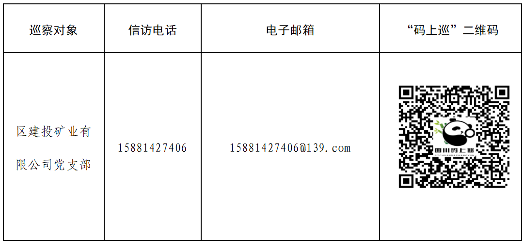據(jù)悉,區(qū)委第三巡察組將進駐區(qū)建投礦業(yè)有限公司開展為期30天的巡察監(jiān)督。巡察期間(5月13日—6月13日)設專門信訪電話:15881427406,電子郵箱:15881427406@139.com,并在區(qū)建投礦業(yè)有限公司正門保安處(安州區(qū)花荄鎮(zhèn)大北街074號)、區(qū)建投礦業(yè)有限公司一樓子公司辦公點(安州區(qū)花荄鎮(zhèn)大東街005號)設置了征求意見箱,同步發(fā)布四川“碼上巡”二維碼,并設有信訪接待點(受理群眾來訪時間為工作日9:00-12:00;14:00-17:00),信訪接訪點地址為:安州區(qū)群眾來訪接待中心(安州區(qū)花荄鎮(zhèn)銀河大道8號)。根據(jù)巡視工作條例規(guī)定,巡察組主要受理反映區(qū)建投礦業(yè)有限公司黨支部領導班子及其成員、下一級機構領導班子主要負責人、重要崗位領導干部是否存在違反政治紀律、組織紀律、廉潔紀律、群眾紀律、工作紀律和生活紀律等方面的舉報和反映。其他不屬于巡察受理范圍的信訪問題,將按照分級負責、屬地管理原則,轉交有關單位辦理。